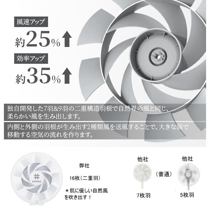 【自然風に近い優しい風を生み出す16枚羽根仕様】16枚ほど多くの羽根で、もっと自然風に近い、体当たりがいい、繊細な風に。流体力学を利用した独自の技術により空気の流れが自然の風に近い状態で送風します。羽根に工夫を凝らして風が心地よい、長時間当たっていても体がだるくなりにくく、冷えすぎを最小限に低減します。