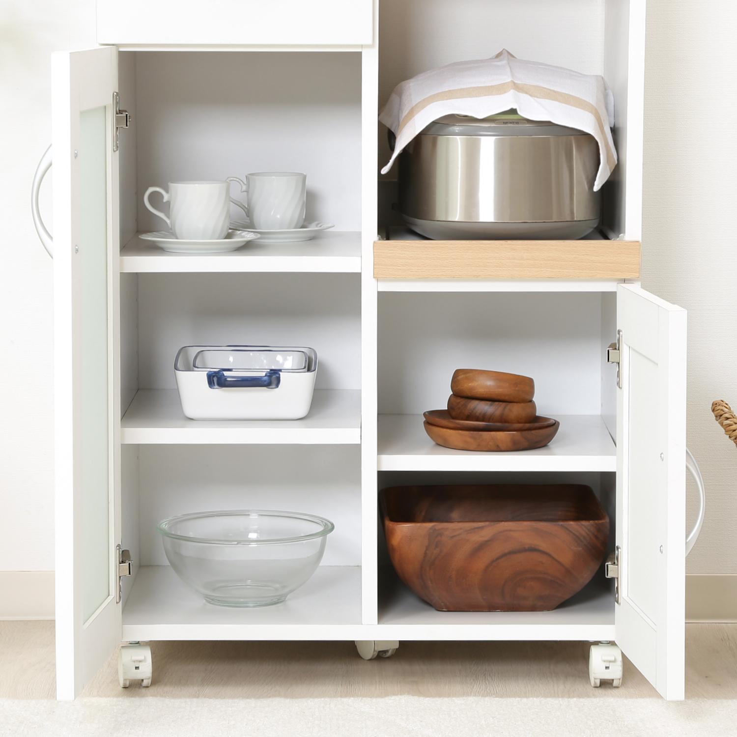 2つの戸棚に分かれていて、細やかな収納が可能。食器や缶詰、お菓子などスッキリ収納できます。