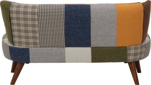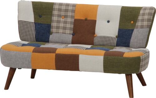 カラフルなパッチワークがお部屋を一気に華やかに彩る、2人掛けソファ「デイジー」。ブルーとイエローの明るい色合いが、リラックスした空間を演出します。パッチワークの模様は手作り感満載で、一つ一つが丁寧に縫製されています。座面と背もたれは柔らかいクッションで包まれており、座り心地も抜群です。