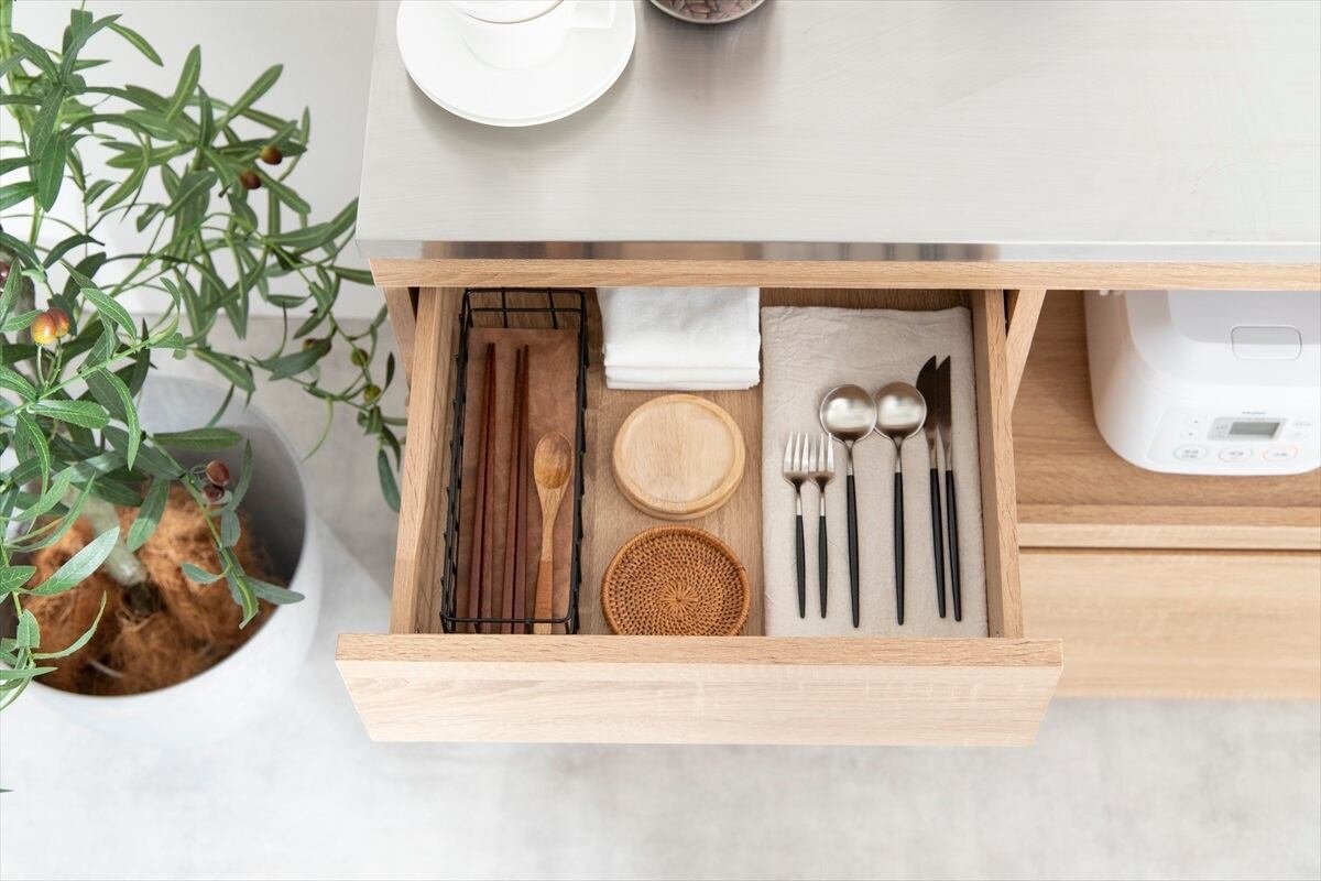 【耐荷重】ステンレス天板:約25kg、スライドトレー:約8kg、上段引き出し収納:約3kg、